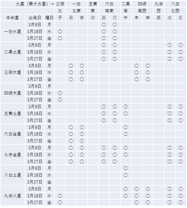 2026年3月の吉方位(○印)を九星別にみていきましょう。