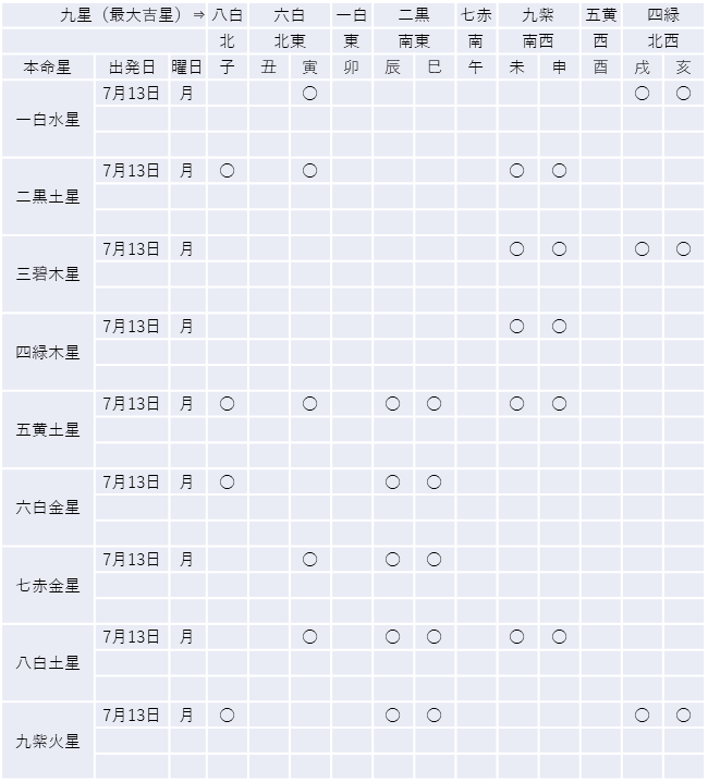 2026年7月の吉方位(○印)を九星別にみていきましょう。